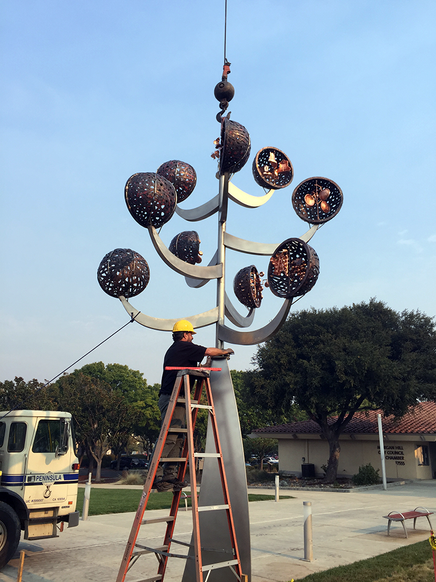 Commissioned by the City of Morgan Hill, this sculpture stands 20 feet high in the city plaza welcoming and greeting residents and visitors alike. It is a narrative sculpture that tells a story of city's past and celebrates current vibrant community.